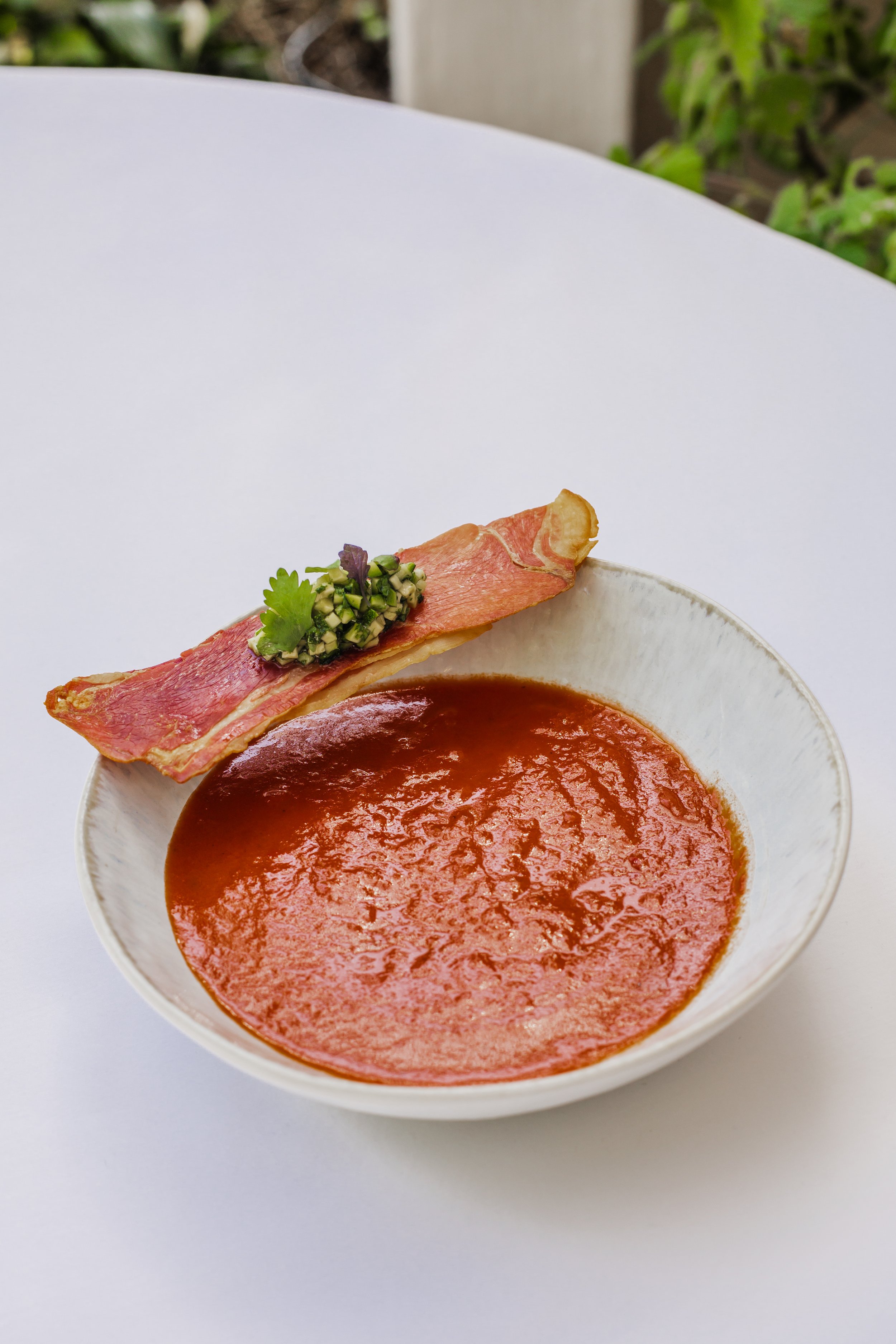 Cold soup of tomato, cucumber, garlic, red bell peppers, white wine vinegar, smoked Paprika. Crispy smoked prosciutto, chopped courgette and coriander salad