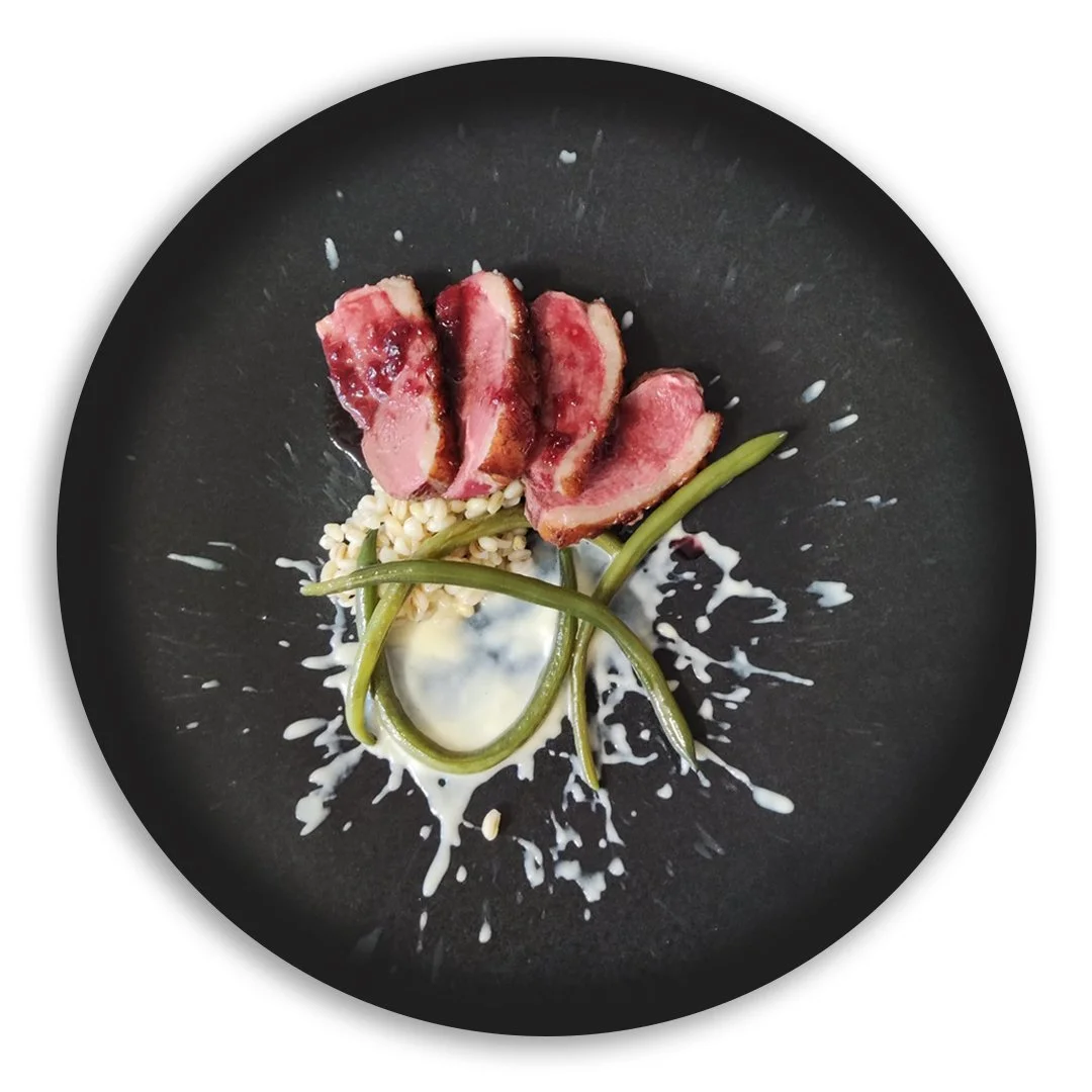 Red wine and cherry sauce, cauliflower purée, green beans, barley