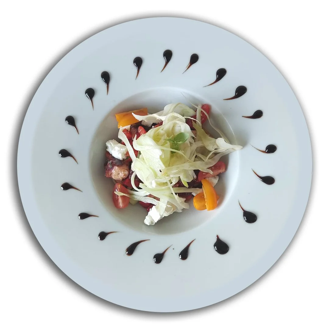 Grilled octopus, cucumber, roasted bell peppers, cherry tomatoes, feta, fennel salad, balsamic cream