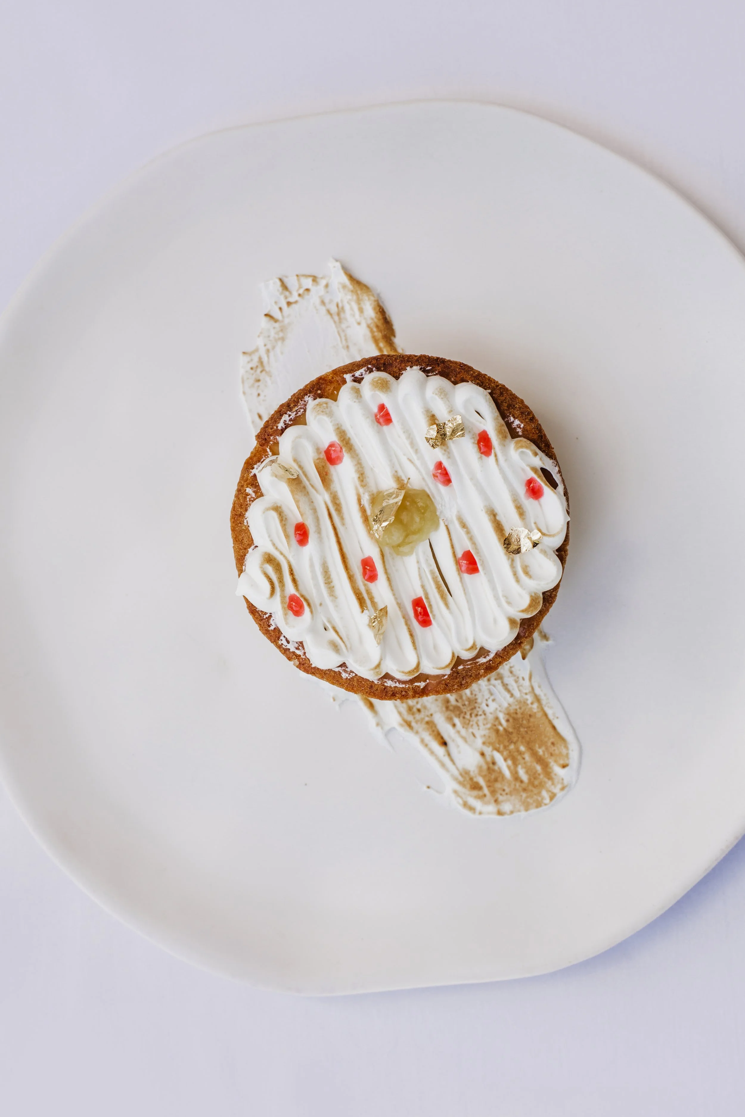 Vanilla-flavoured crust, pistachio and raspberry frangipane, lemon coulis, Italian meringue, raspberry coulis, and lemon jelly topping, gold leaf sheets