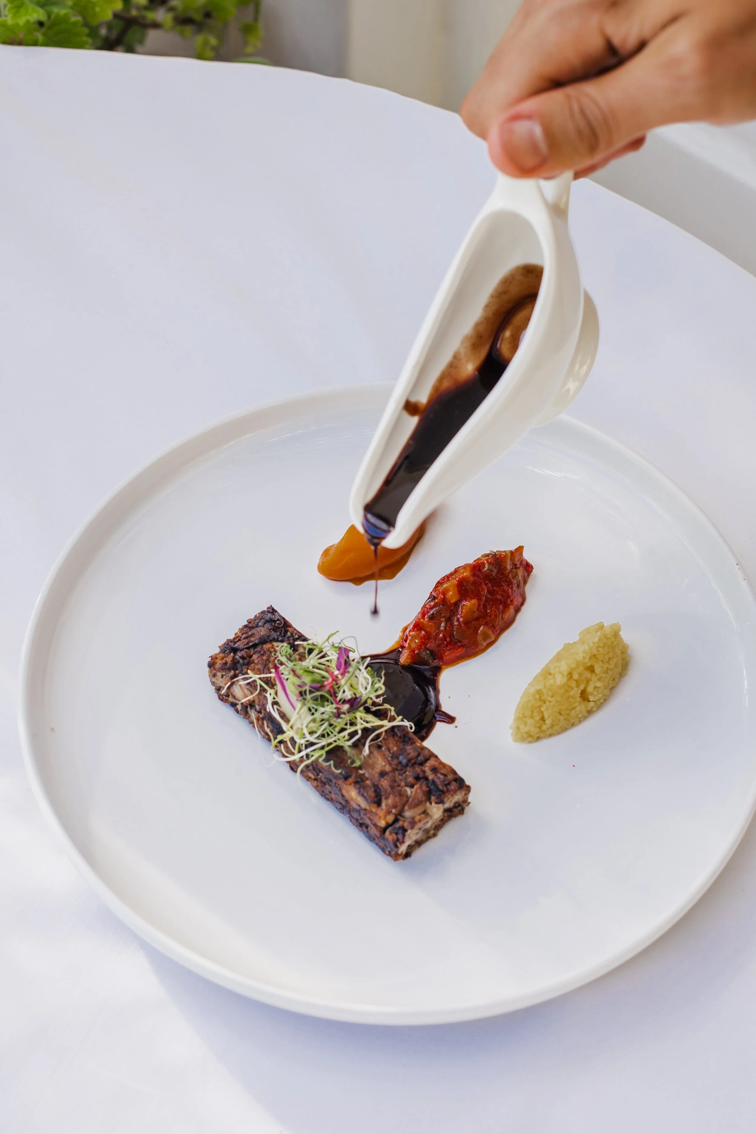 Braised lamb shoulder, ratatouille, sweet potato purée, couscous, lamb Demi-Glaze